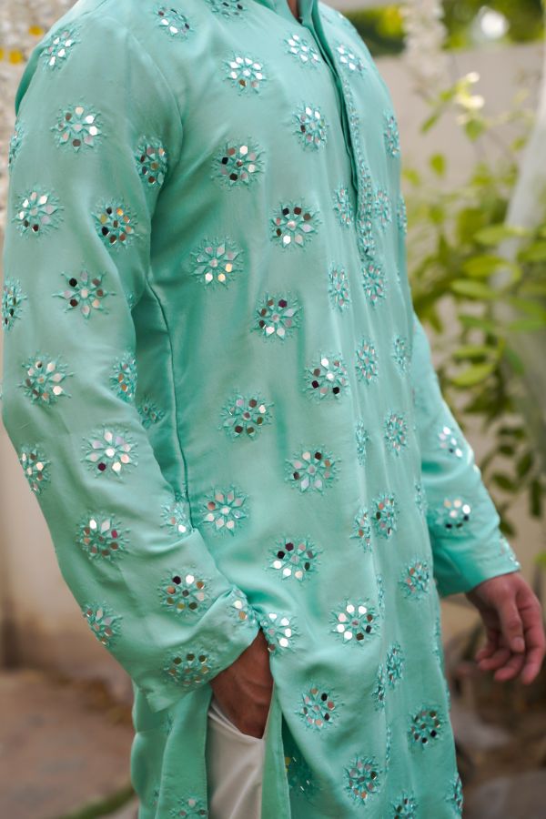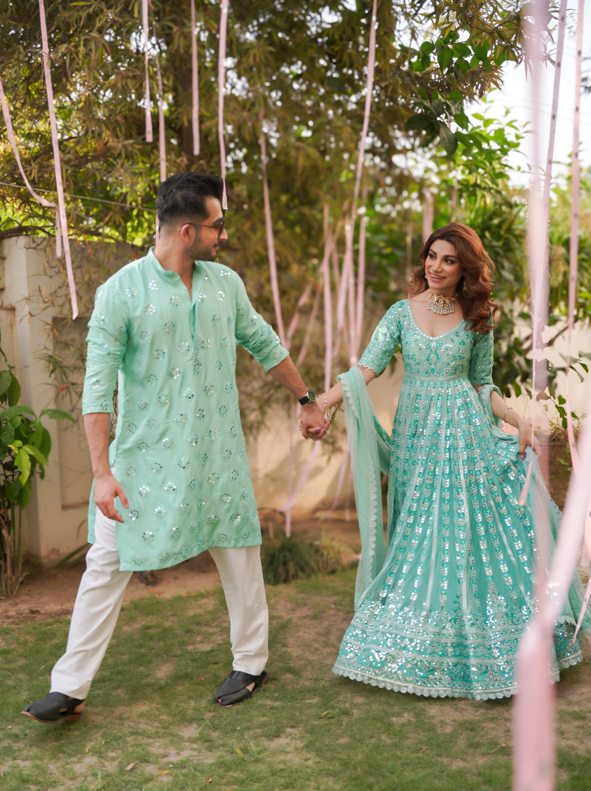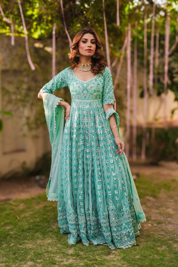 A fully worked floor length traditional pishwas with heavily embroidered mirror work details all over. Lined with a unique shimmer chiffon and silk lining to give that golden hour glow. Paired with a floor length lehnga and mirror work dupatta.