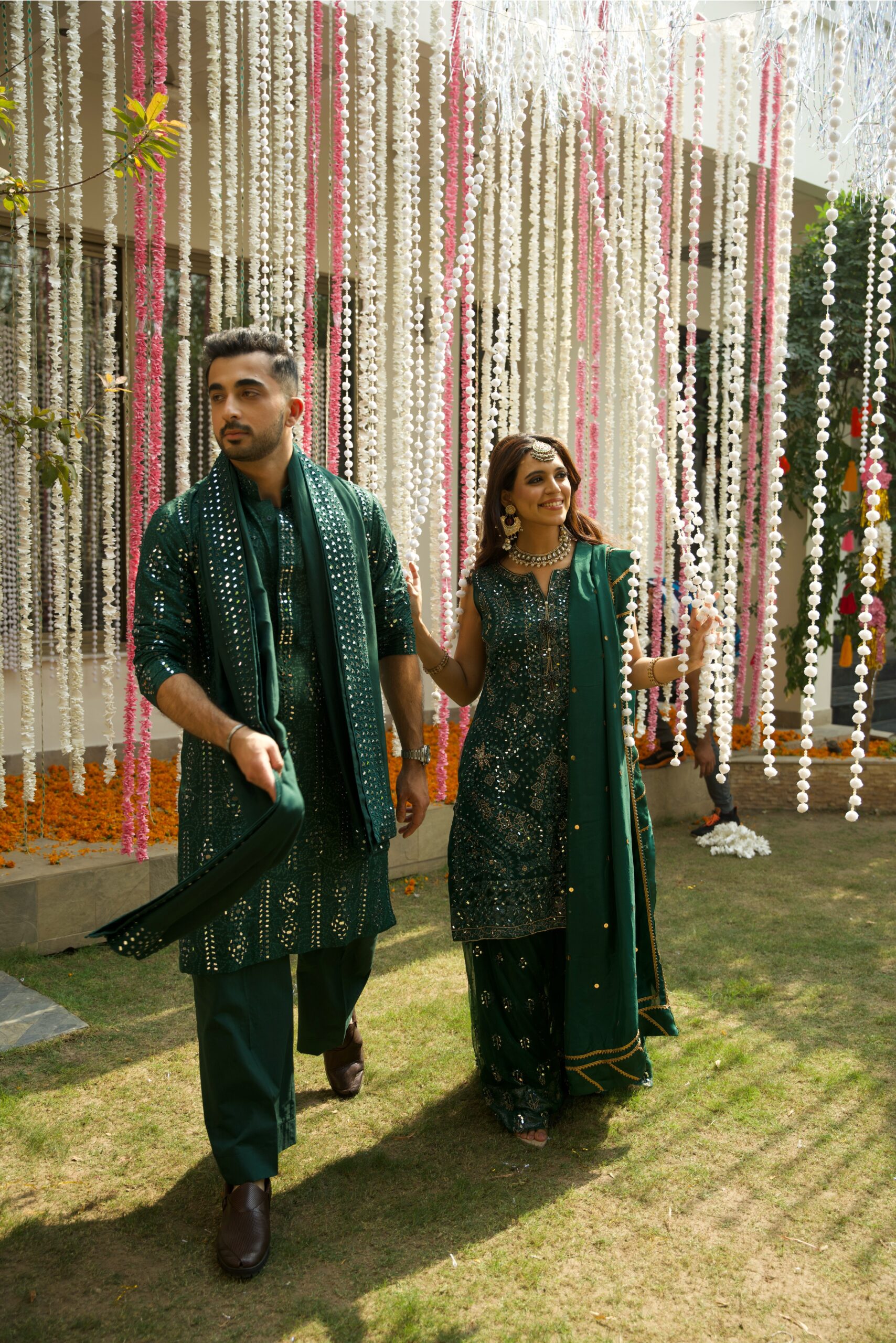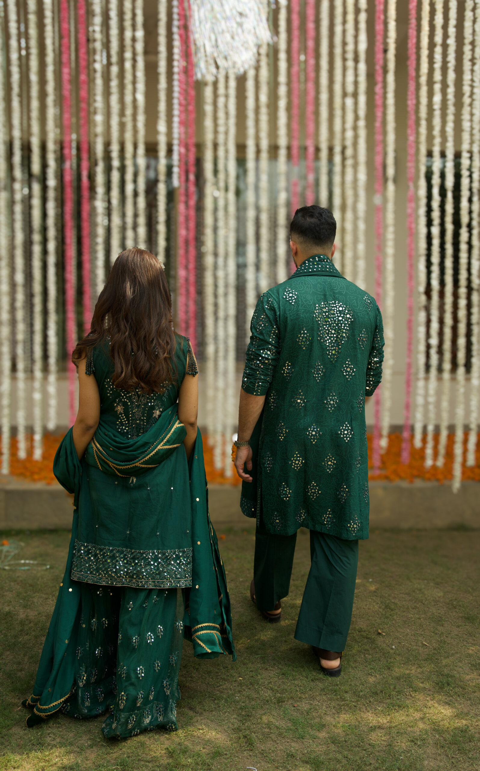 A fully worked Sharara Set with heavily embroidered mirror work details all over. Lined with a silk lining.