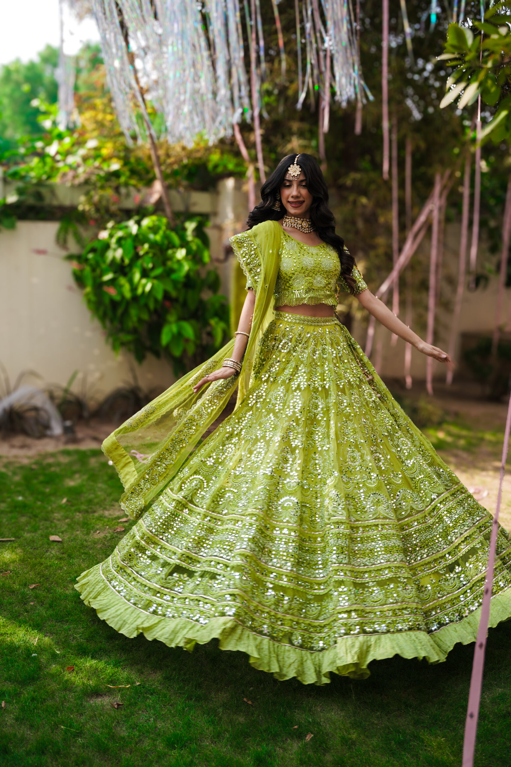 A fully worked Lehnga Choli Set with heavily embroidered mirror work details all over. Lined with a unique shimmer chiffon and silk lining to give that golden hour glow. Lehnga will have a separate can can underneath. paired with a mirror work dupatta.