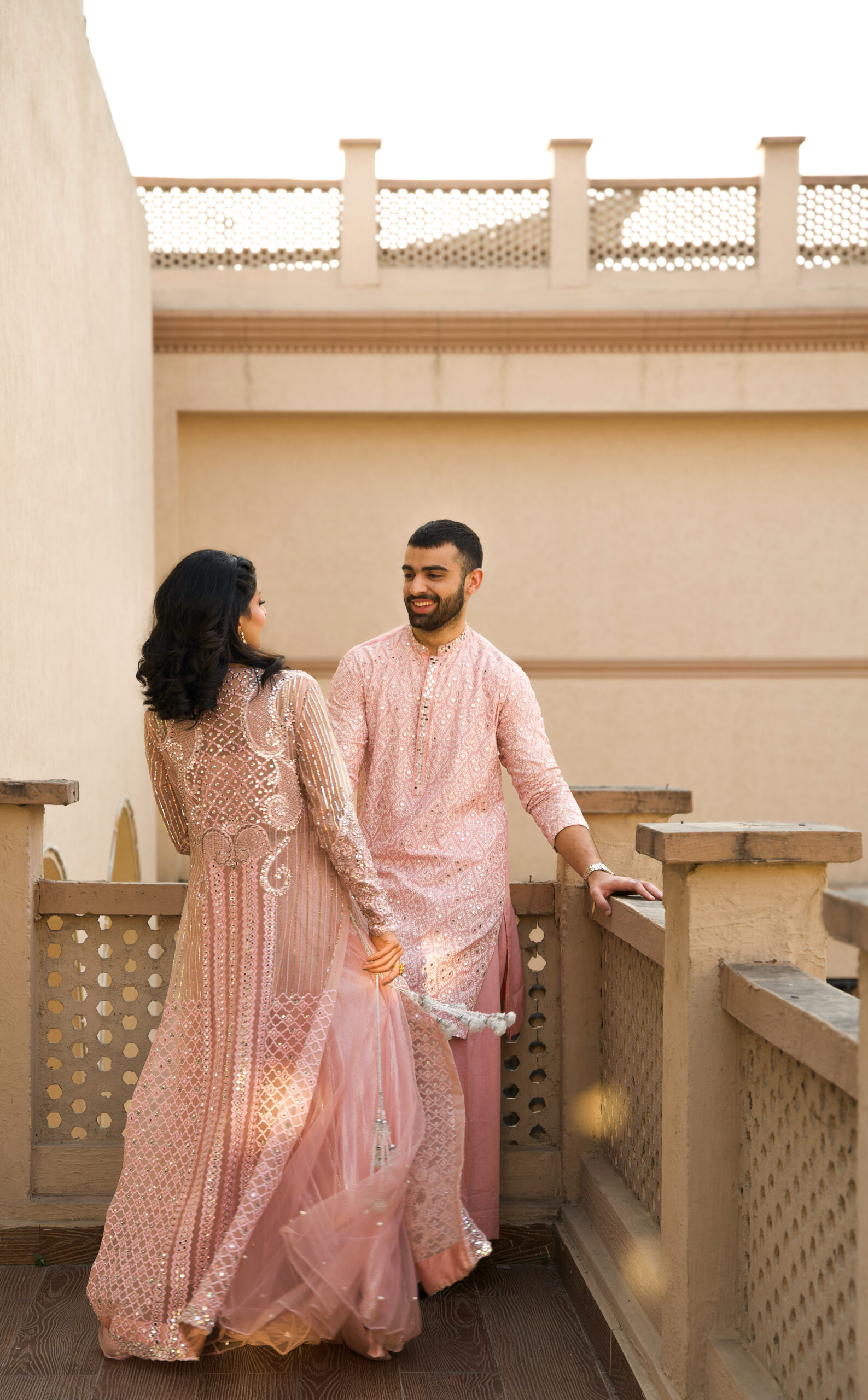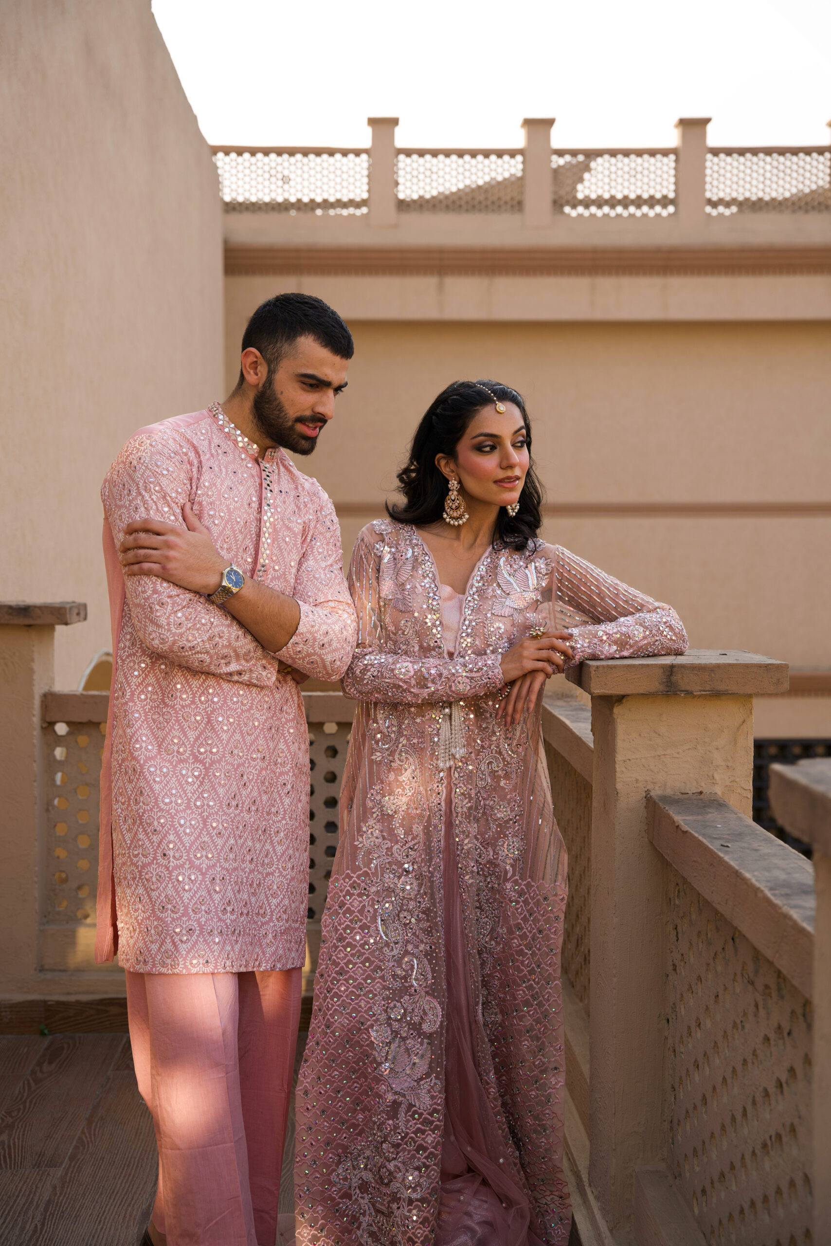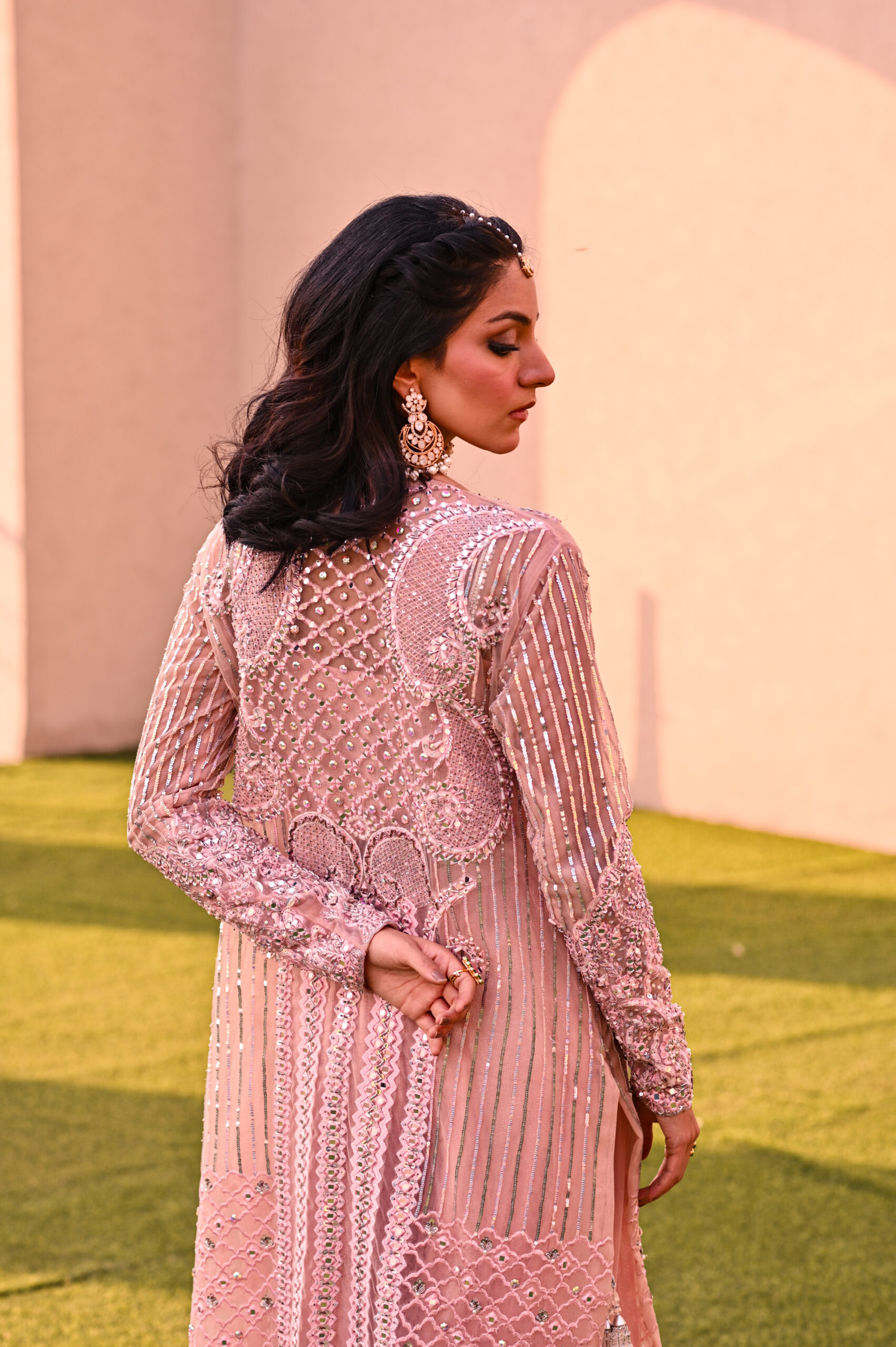 A fully hand worked long jacket Set with heavily embroidered mirror work details all over. Lined with a unique shimmer silk lining and paired with flowy net pearlly Sharara.