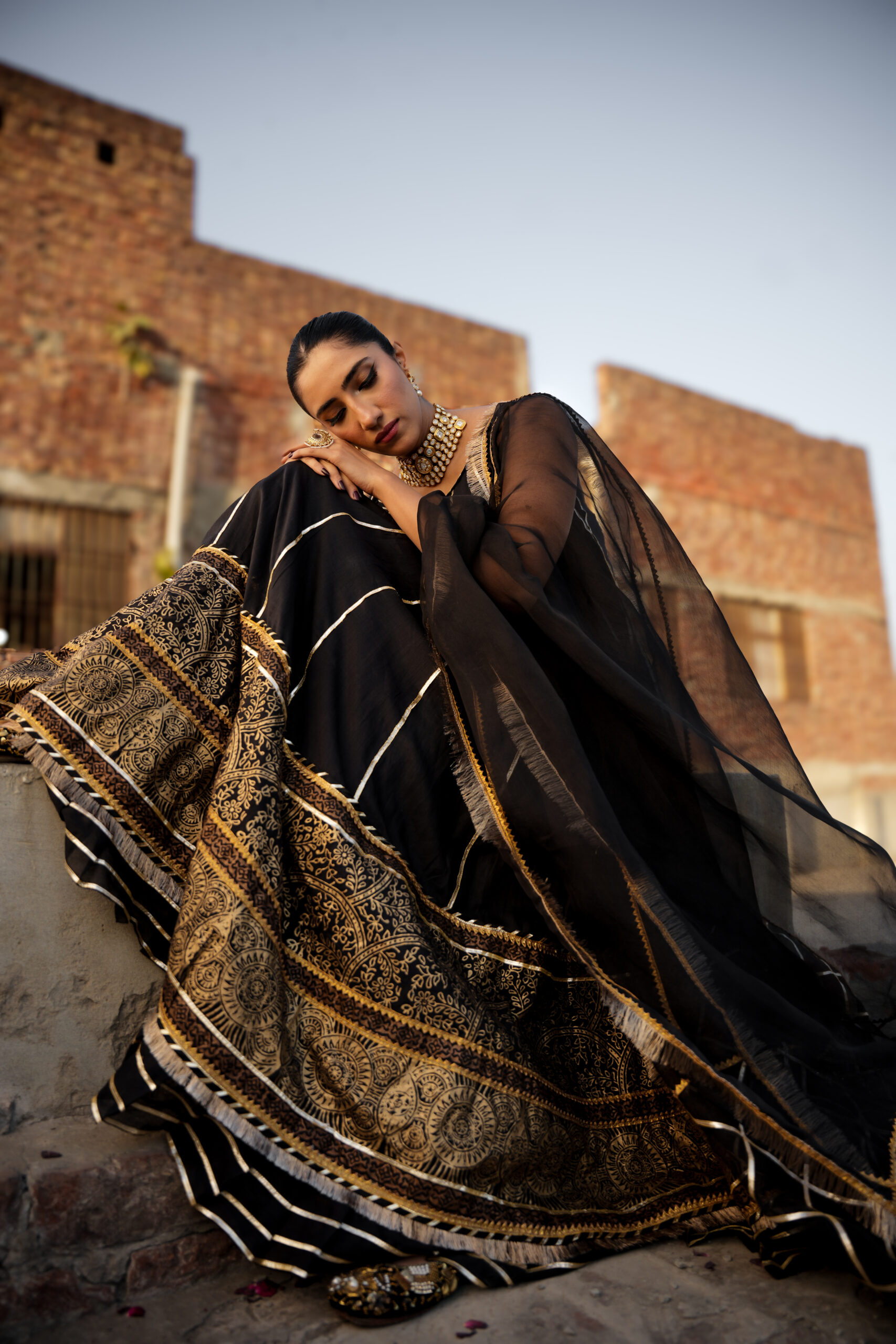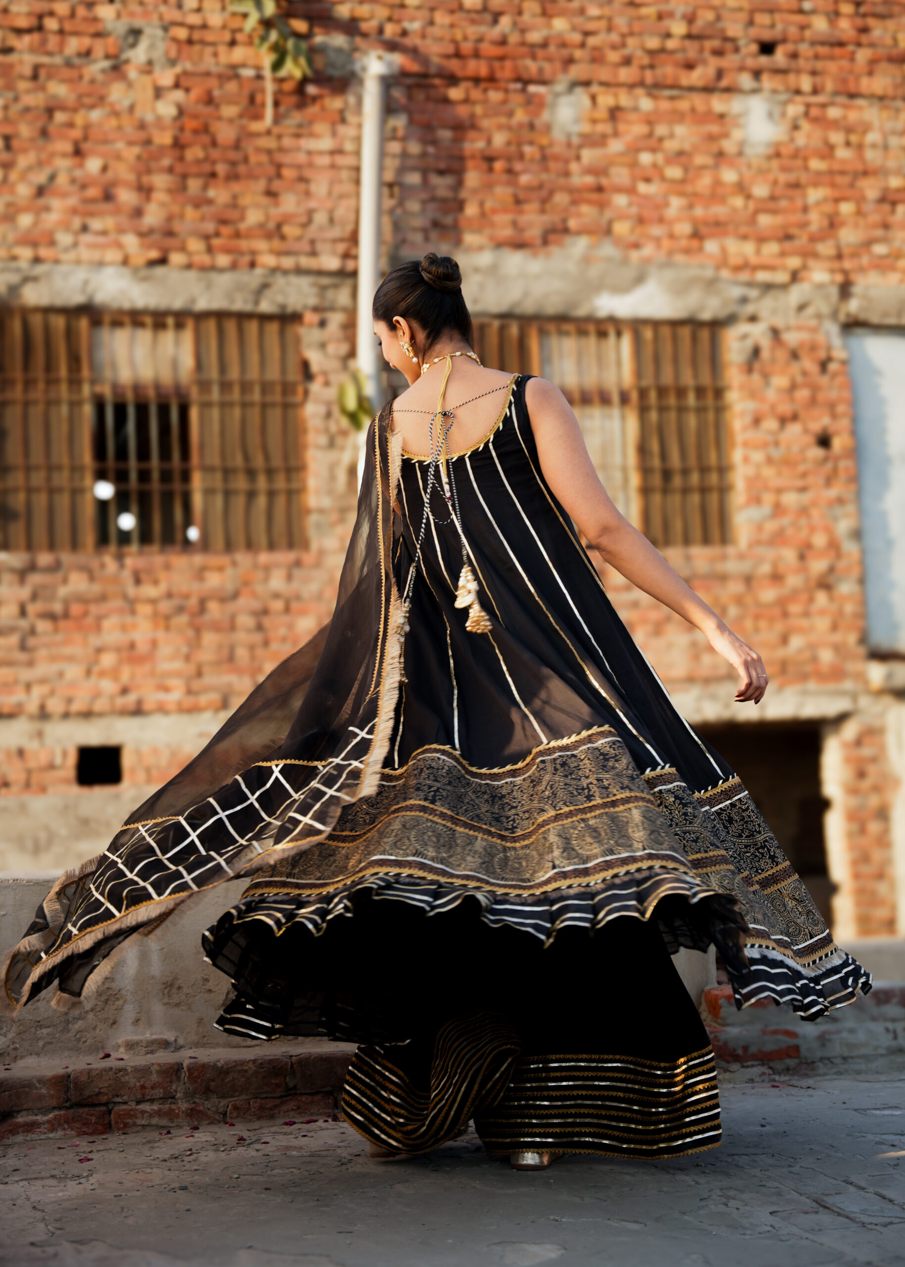 Product Details: Hand block printed kalidar with cotton silk slip, lawn hand block printed dupatta and a viscose trouser. Laces may differ as per availability.
