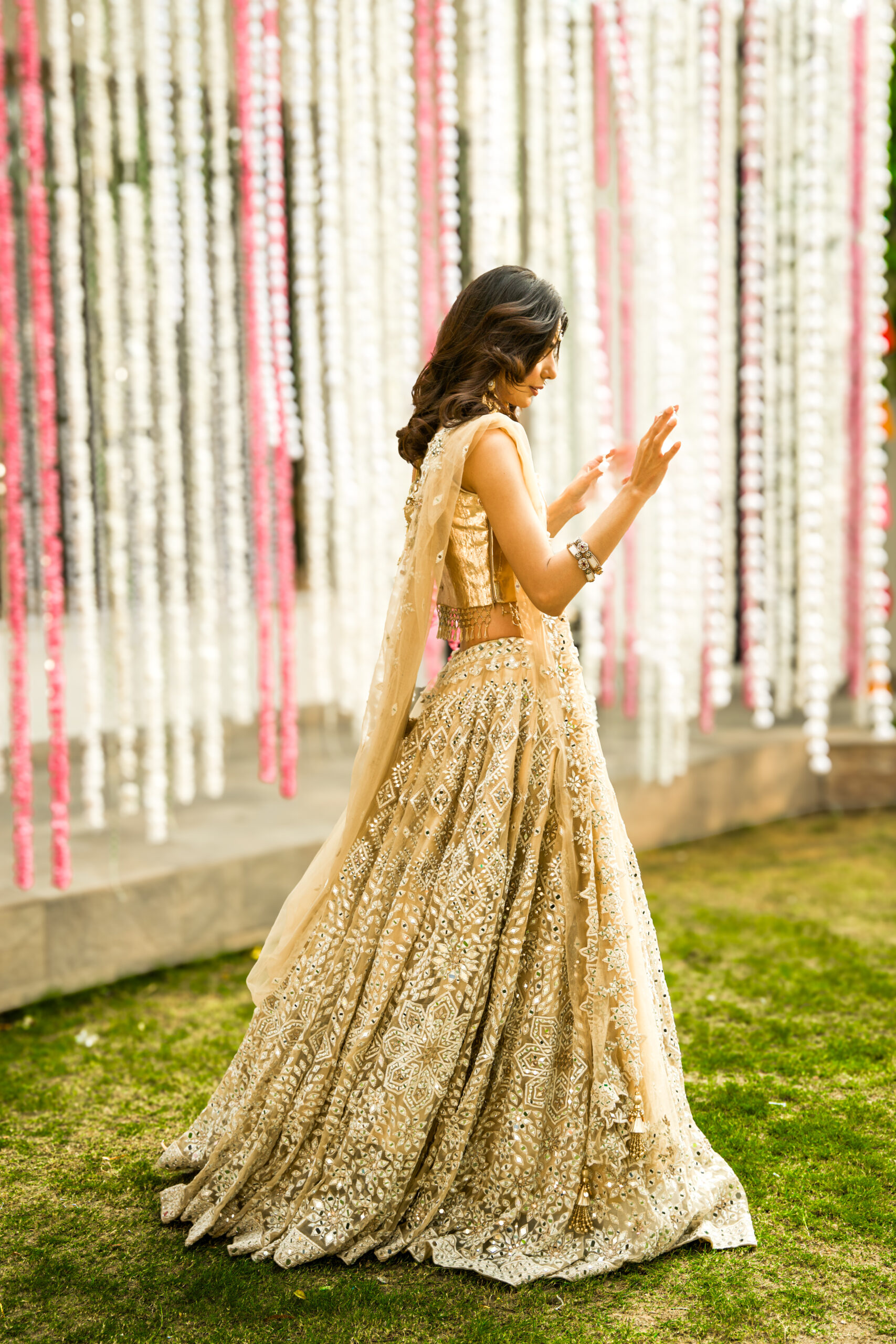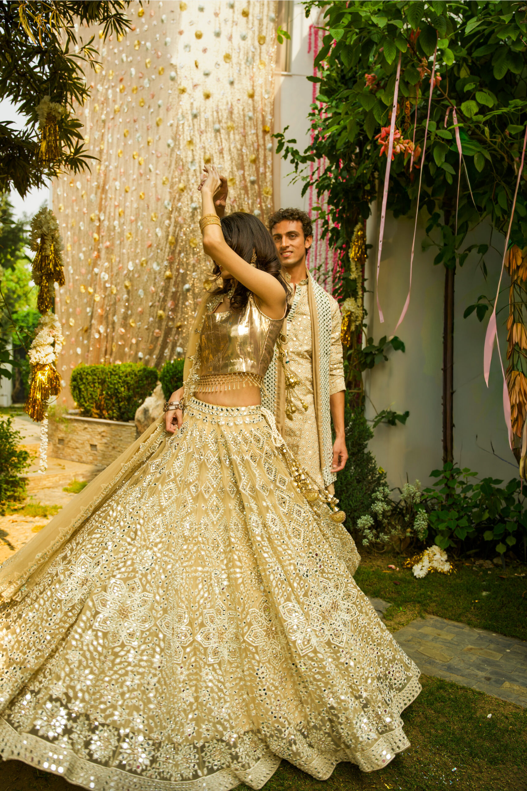 A fully worked Lehnga Choli Set with heavily embroidered mirror work details on the lehnga and dupatta. Lined with a silk lining and paired with a plain gotta choli. Lehnga will have a separate can can underneath. paired with a mirror work dupatta.